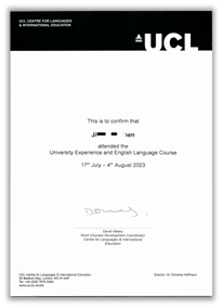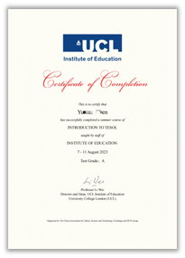 顺利完成课程后,学生将获颁由伦敦大学学院语言与国际教育中心签发的结业证书、个人评估报告以及由伦敦大学学院教育学院颁发的项目结业证书。来自世界名校的结业证书不仅是学生未来申请深造或职业发展的重要加分项,更是彰显个人学术能力与国际化经历的重要背景材料。同时,可兑换我校3个课外学分(依据《湖州师范学院学生课外学分管理办法》,由二级学院认定)。