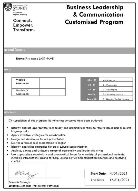 (悉尼大学项目证书和成绩单样本)
