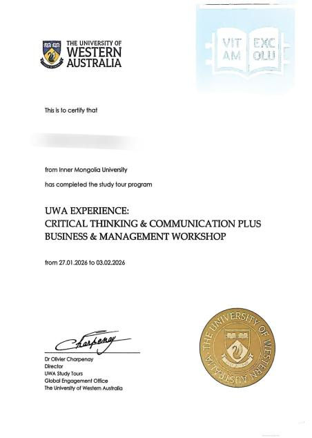 顺利完成课程后,学生将获得西澳大学项目结业证书。来自世界名校的结业证书不仅是学生未来申请深造或职业发展的重要加分项,更是彰显个人学术能力与国际化经历的重要背景材料。同时,可兑换我校3个课外学分(依据《学生课外学分管理办法》,由二级学院认定)。