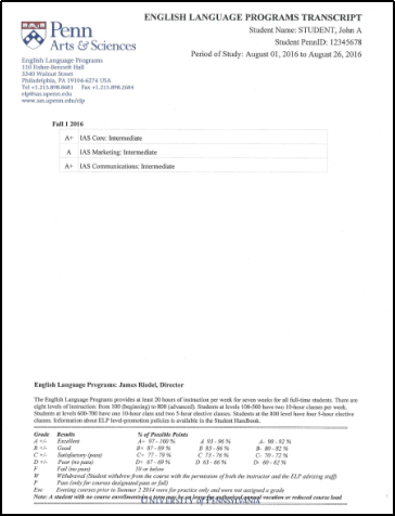 图:宾大语言文化课程成绩单